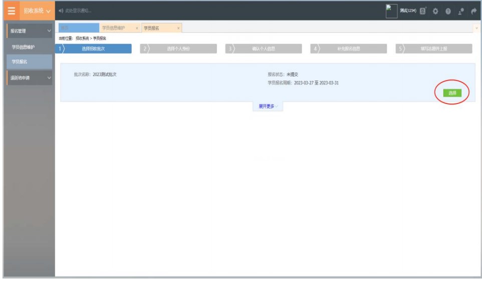第一步,选择招收批次界面,单击“选择”按钮,下图所示