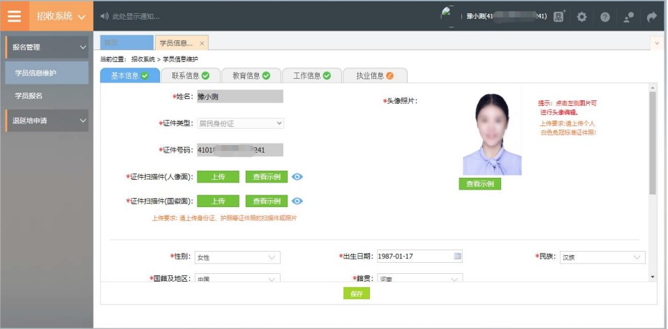 在学员信息维护界面里,单击“基本信息”,填写您的个人信息,确认无误后,点击“保存”,如下图所示。(带“*”的 为必填项)